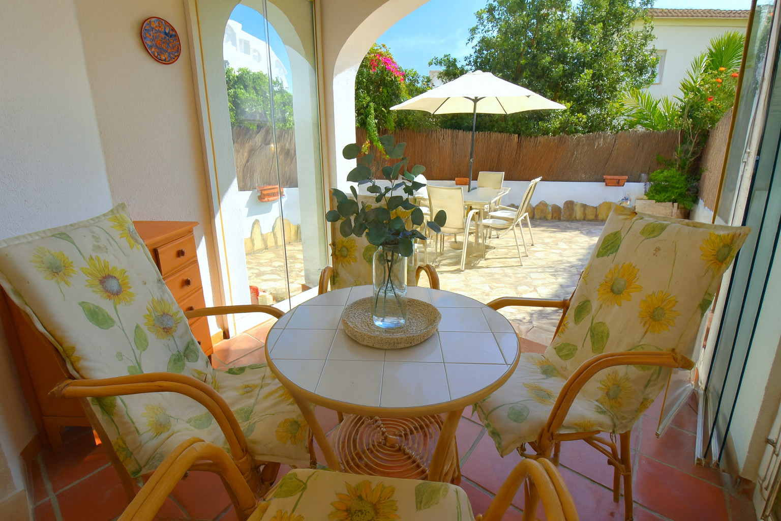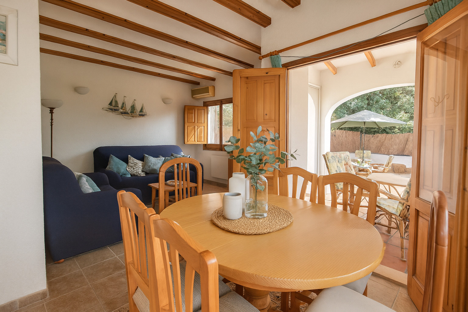 Salon-salle à manger lumineux avec deux canapés, table à manger pour six personnes, téléviseur plasma et accès direct à la terrasse couverte avec des meubles en osier.